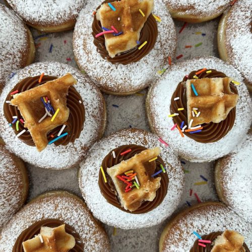 סופגניה במילוי וזילוף ריבת חלב, וופל בלגי וסוכריות